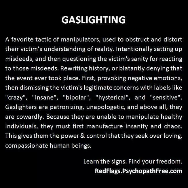 Gaslighting is a form of manipulation that seeks to sow seeds of doubt in a targeted individual or members of a group, hoping to make targets question their own memory, perception, and sanity. Using persistent denial, misdirection, contradiction, and lying, it attempts to destabilize the target and delegitimize the target’s belief.