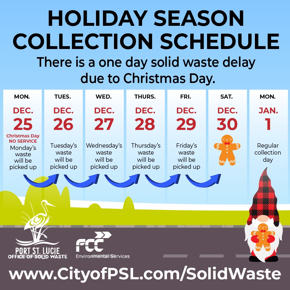 With the approaching holiday, the City of Port St. Lucie’s Office of Solid Waste reminds residents there will be changes in the garbage collection schedule. As a result, all residents’ collections will be delayed one day.