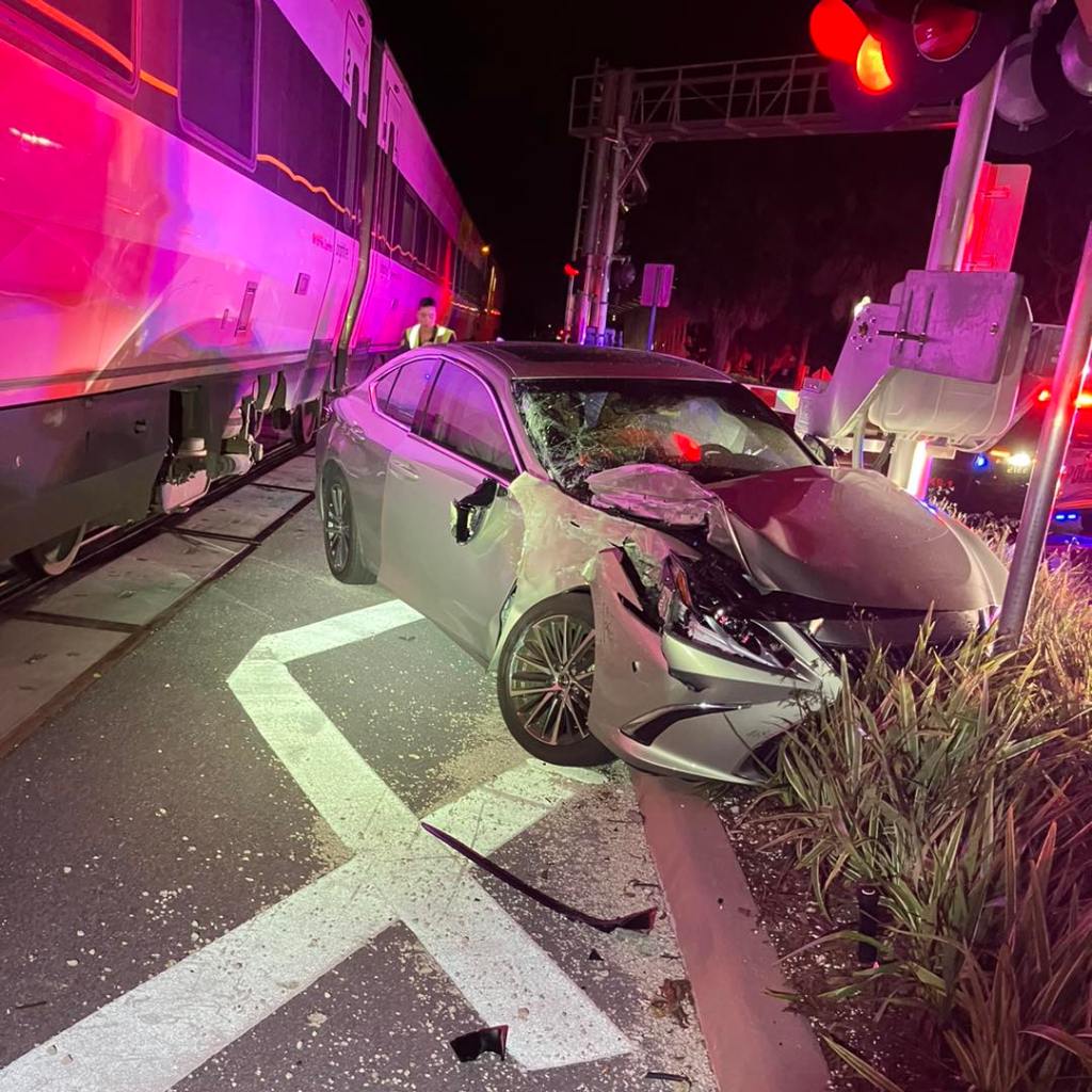 Stuart,Fl – The Stuart Police reported that occupants of a car escaped injury Thursday evening at Confusion Corner where a Brightline train hit their vehicle.