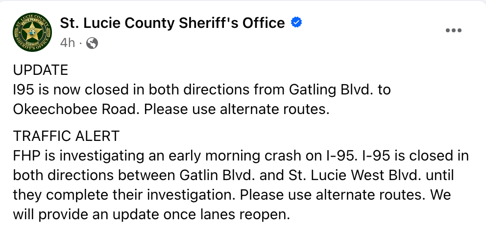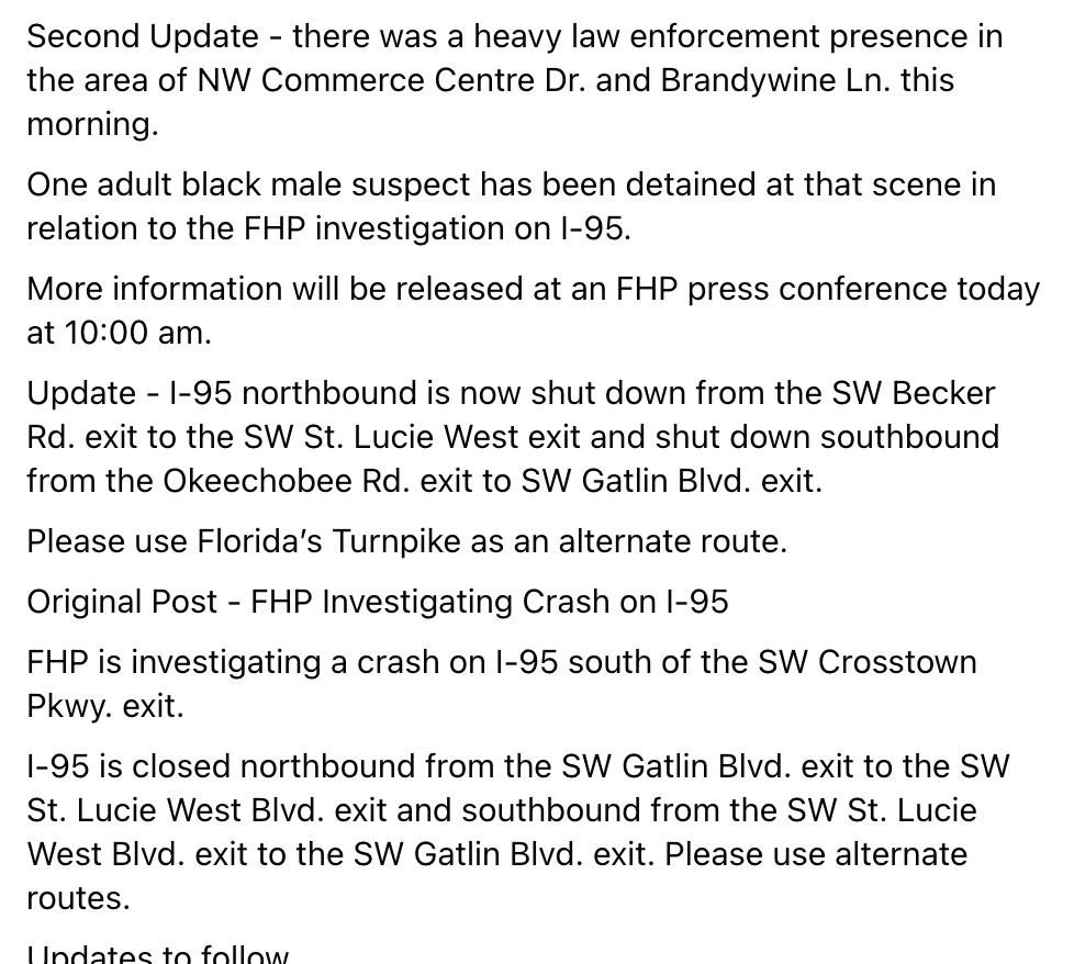 Truck driver tragically killed. Trooper Fink chasing white kia that was initially seen on midway then went on 95 driving irradictly. Trooper Fink was chasing him and the white Kia made a u-turn driving into traffic. Trooper Fink made a u -turn to continue the chase and to warn people there was a car driving in the wrong direction when he collided with the truck. Truck driver doa on the scene. Trooper Fink critically injured and later succumbed to his injuries at Lawnwood. White Kia ended up crashed on commerce. Manhunt by multiple agencies. One of the suspects is in custody.