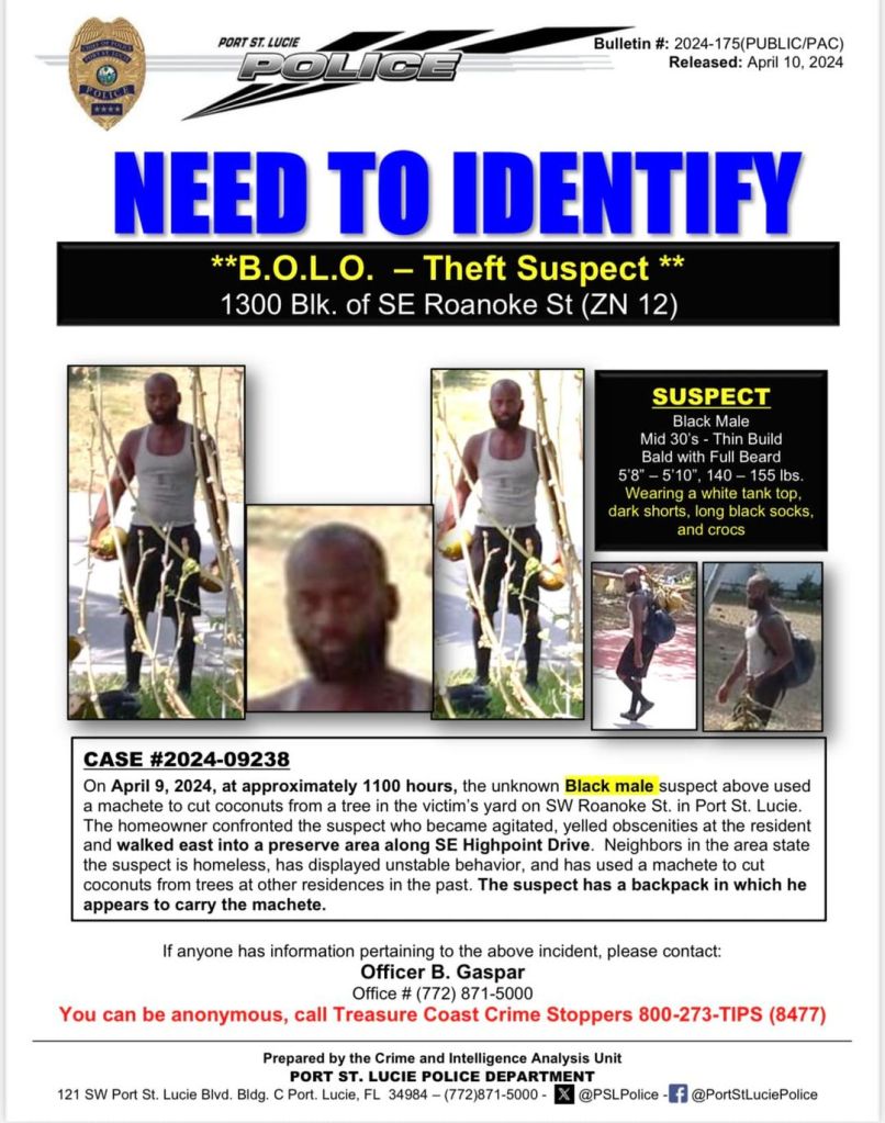 Anyone with information on the suspect’s identity is urged to call Officer B. Gaspar at (772) 871-5000 or Treasure Coast Crime Stoppers at (800) 273-8477.