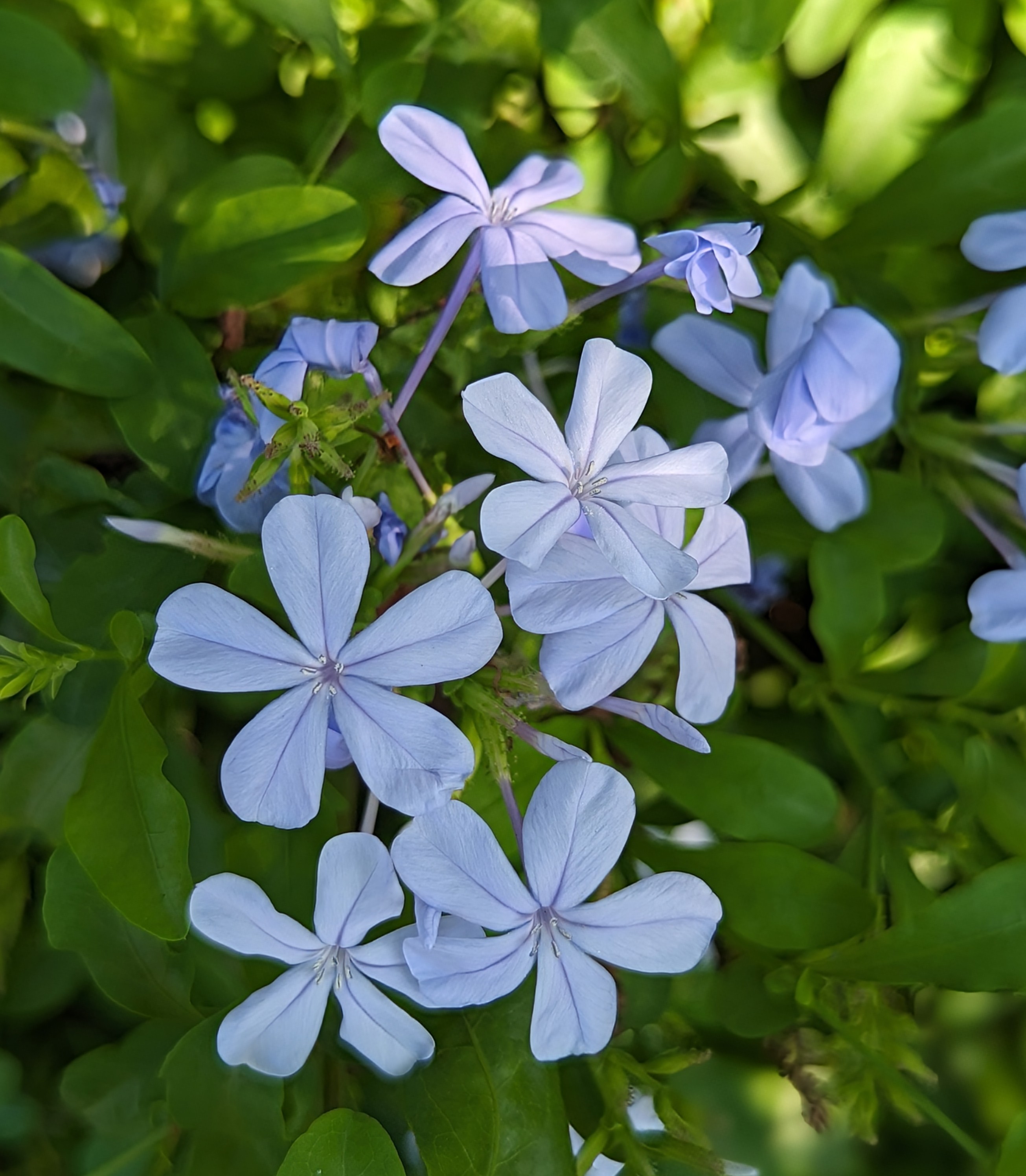 Blue Plumbago is deceptively easy to grow. The rambling shrubs can grow to about five feet tall and ramble a long way from where they started. Start plants about three feet apart to get a good screening hedge. They can bloom year round but are more prolific from spring to fall. These shrubs can take about six hours of full sun and may show leaf scorch if left in full sun all day. Mine thrive and flower in partial shade with well drained soil and no irrigation.