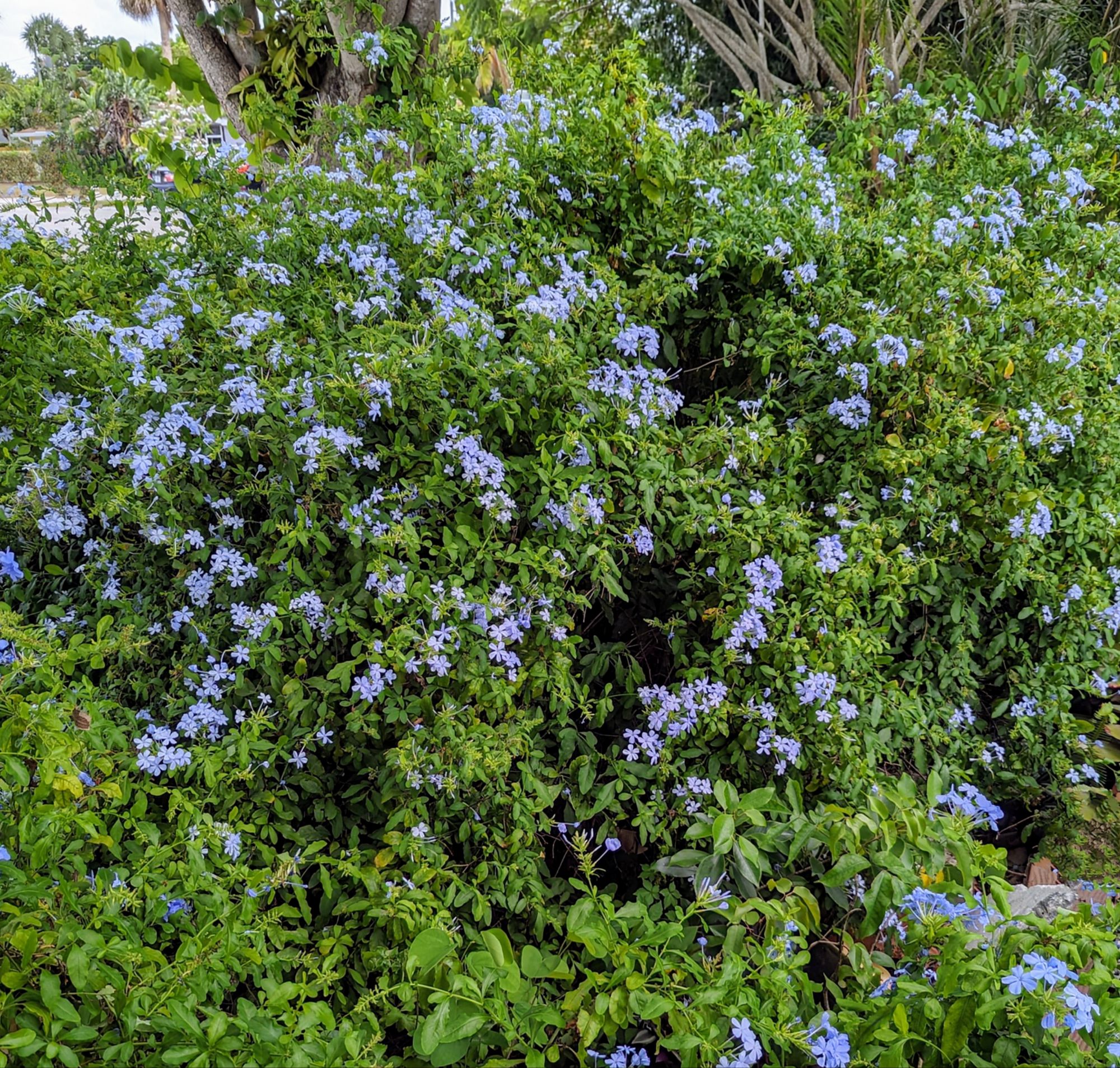 One of my favorite shrubs started blooming in earnest recently. The Blue Plumbago (Plumbago auriculata) Gardeners pining for the glorious blue mophead hydrangeas that are stars of the summer garden further north use these as a great stand-in. I gave up on hydrangeas in my Treasure Coast Garden years ago despite the fact that some people have success with them.