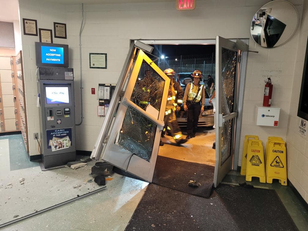 The suspect drove from the parking lot, up the walkway then crashed through the glass lobby doors. He was not able to breach the inner steel security doors. No one was in the lobby at the time of the crash. The driver is in custody. #WrongEntrance